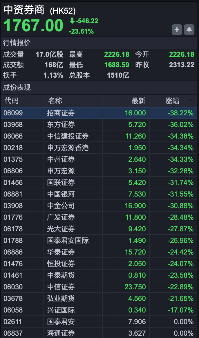 具体来看盘面,中资券商股成为最大下跌动能。其中,招商证券、东方证券、中信建投、申万宏源、中州证券、国联证券、中国银河、中金公司等,跌幅均超过30%。券商龙头中信证券跌幅也超过20%。