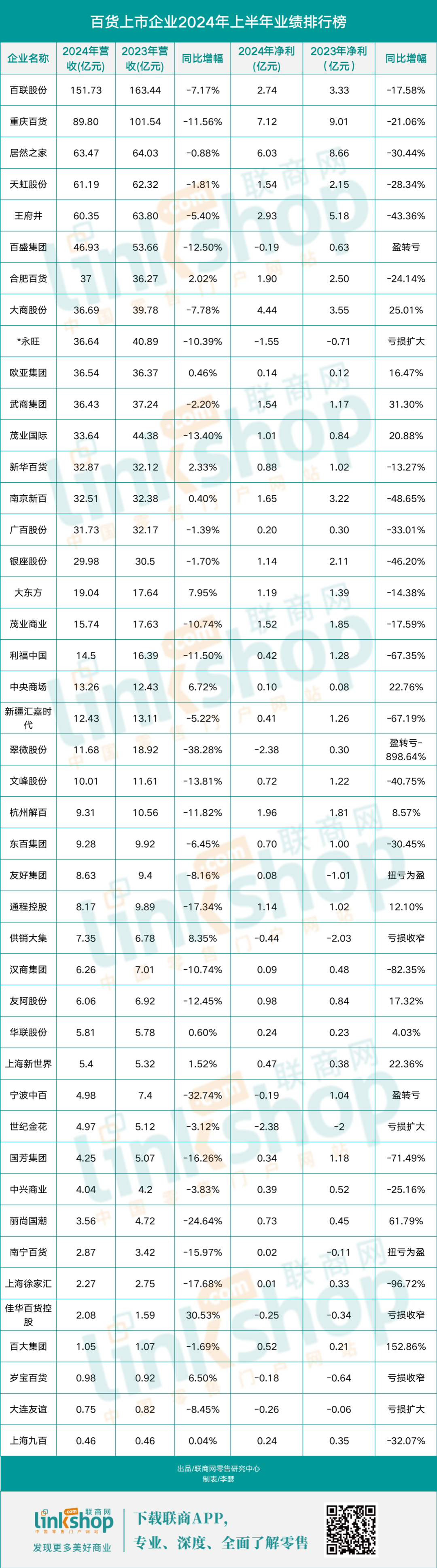 附:2024年上半年百货上市公司业绩排行榜