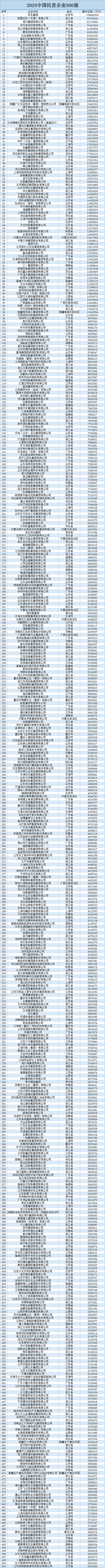 今年全国工商联组织开展第26次上规模民营企业调研,共有9642家2023年营业收入5亿元以上的企业参加,其中营业收入前500位的企业为2024中国民营企业500强。京东、阿里巴巴、恒力集团位列前三。