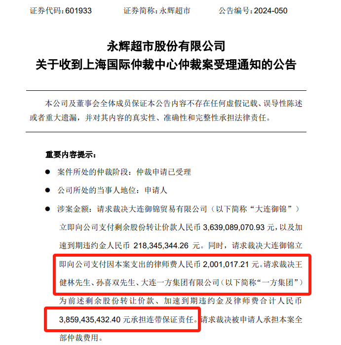 10月13日晚间,永辉超市发布公告,10月12日,公司收到上海国际经济贸易仲裁委员会(以下简称“上国仲”)受理通知,主要内容为:上国仲收到公司提交的永辉超市与大连御锦贸易有限公司、王健林、孙喜双、大连一方集团有限公司关于《股份转让协议》及《补充协议》仲裁案件的仲裁申请书及附件,于2024年10月12日决定受理。