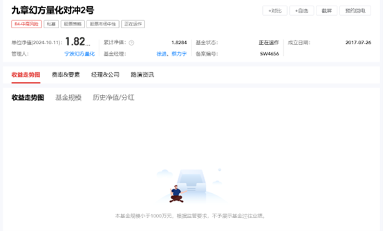 例如正在运作的“对冲2号”产品,截至10月11日最新净值为1.82,但因“基金规模小于1000万元”未展示过往业绩。