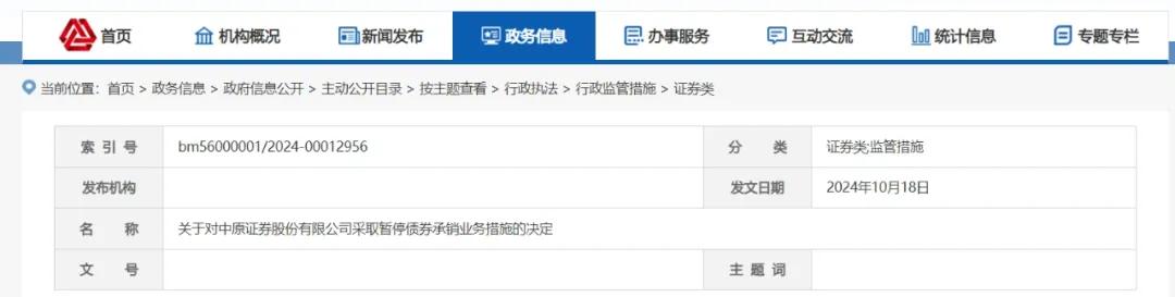 关于对中原证券股份有限公司采取暂停债券承销业务措施的决定