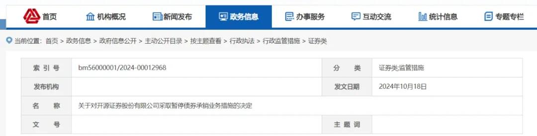 关于对开源证券股份有限公司采取暂停债券承销业务措施的决定