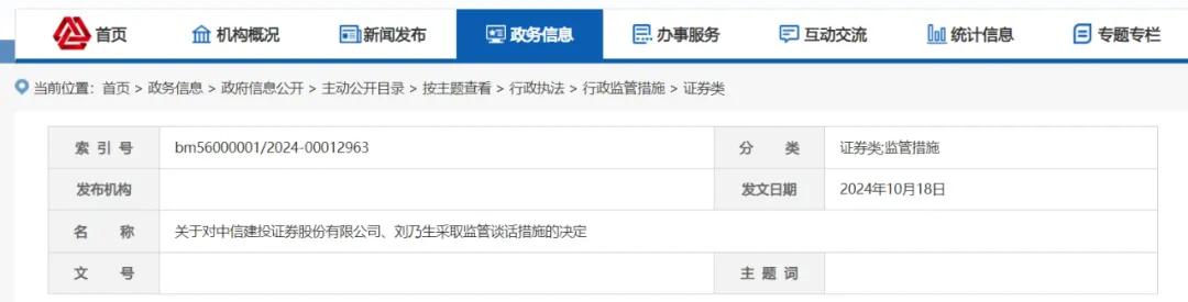 关于对中信建投证券股份有限公司、刘某生采取监管谈话措施的决定