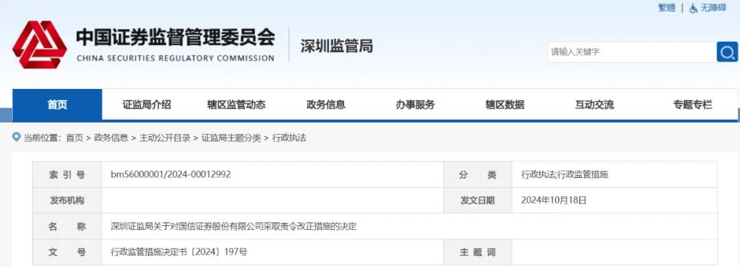 深圳证监局关于对国信证券股份有限公司采取责令改正措施的决定