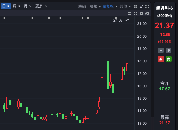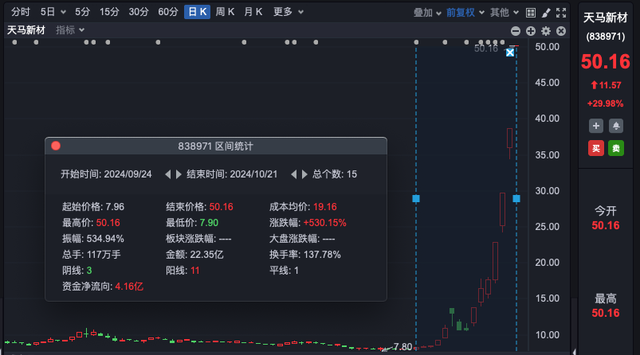 天马新材30%一字涨停,连续4日封板,股价创历史新高,近15个交易日大涨逾530%;坤博精工、创远信科、恒拓开源、威贸电子等近20股30cm涨停。