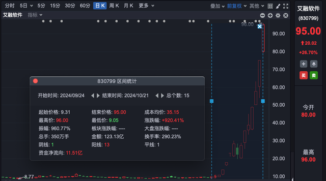 最牛个股华为鸿蒙概念股龙头艾融软件更是自“924行情”以来,由9.31元飙升至今日最高95.68元,短短15个交易日暴涨超9倍。