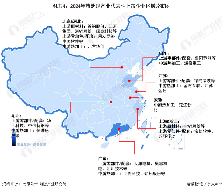 从代表性企业分布来看,热处理产业代表性企业主要分布在北京、广东、山东、江苏等省市。此外,湖北、浙江、上海等地亦有代表性上市公司。