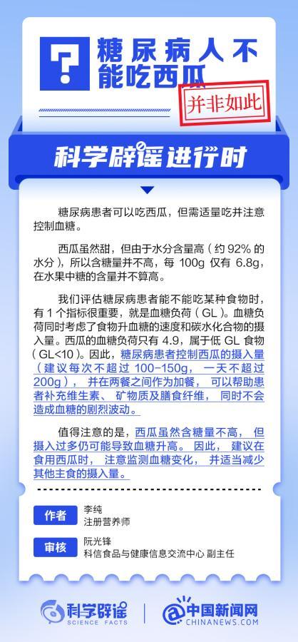 中新网10月21日电 西瓜虽然甜,但由于水分含量高(约92%的水分),含糖量每100g仅有6.8g,在水果中糖的含量并不算高。糖尿病患者可以吃西瓜,但需适量吃并注意控制血糖。(来源:@科学辟谣 中国新闻网微博 )