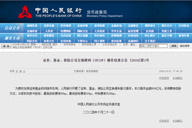 中国人民银行官网今日发布公告,为更好发挥证券基金机构稳市作用,中国人民银行开展了证券、基金、保险公司互换便利首次操作。本次操作金额500亿元,采用费率招标方式,20家机构参与投标,最高投标费率50bp,最低投标费率10bp,中标费率为20bp。