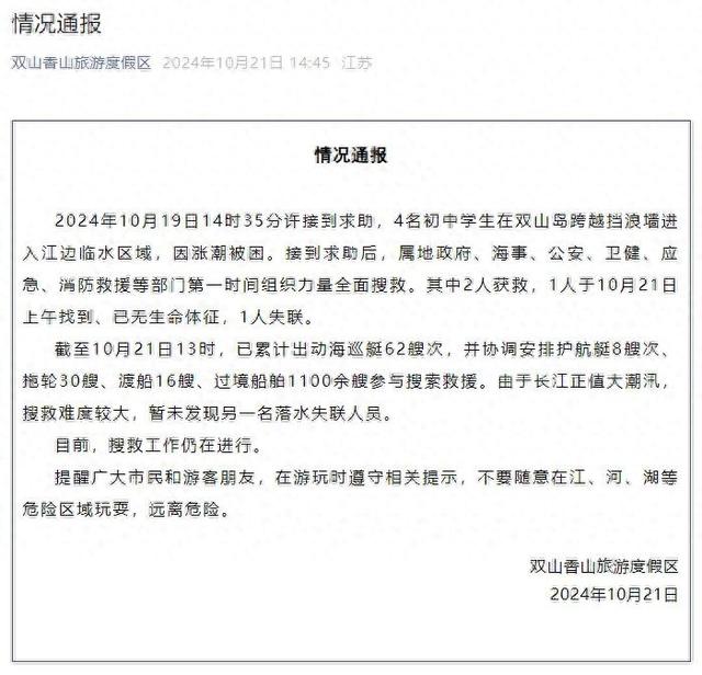 10月21日,江苏张家港“双山香山旅游度假区”公众号发布情况通报称,19日14时35分许接到求助,4名初中学生在双山岛跨越挡浪墙进入江边临水区域,因涨潮被困。接到求助后,属地政府、海事、公安、卫健、应急、消防救援等部门第一时间组织力量全面搜救。其中2人获救,1人于10月21日上午找到、已无生命体征,1人失联。