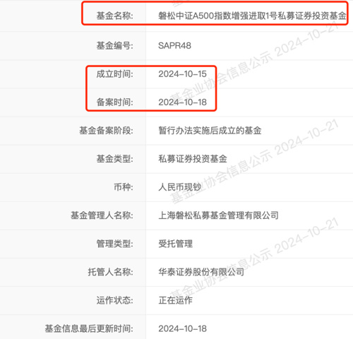 基金业协会网站信息显示,新晋百亿元级量化私募机构——上海磐松私募基金管理有限公司(以下简称磐松资产)在今年10月15日发行了“磐松中证A500指数增强进取1号私募证券投资基金”,备案日期是10月18日,托管在华泰证券。据了解,这是首只布局中证A500指数的私募基金。