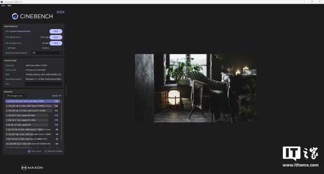 在 CineBench 2024 中,酷睿 Ultra 9 285K 获得了单核 140 分,多核 2351 分的成绩,单核表现同样亮眼,正常默频成绩应该是 140-141 分。