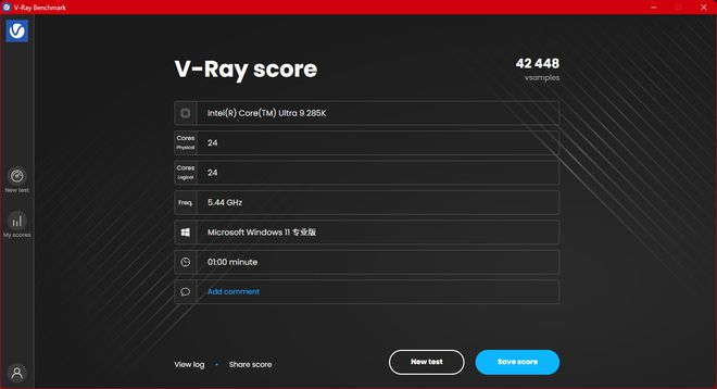 在 3D 渲染软件 V-Ray BenchMark 6 的 CPU 测试中,酷睿 Ultra 9 285K 达到了 42448 分的成绩。