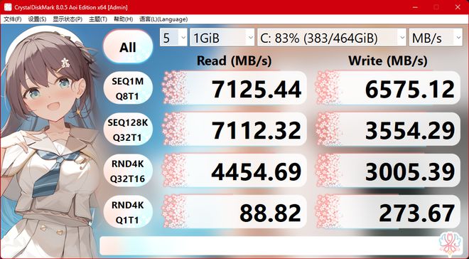 硬盘方面我们也顺便测了下,这块标注规格为 7450MB/s 顺序读取速度和 6500MB/s 顺序写入速度的雷克沙 NM800 Pro 插在主 M.2 插槽上,在 83% 脏盘的情况下跑到了 7125MB/s 的顺序读取速度和 6575MB/s 的顺序写入速度。