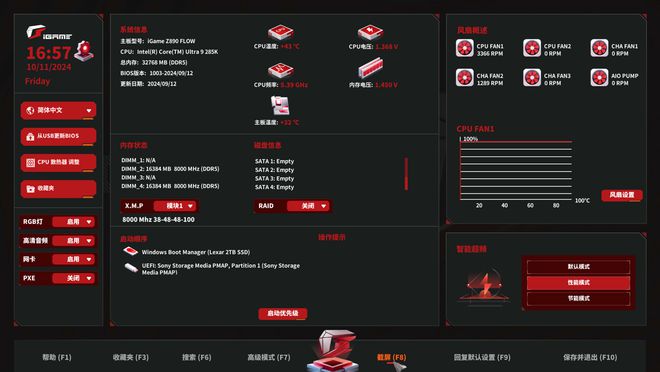 右侧上方是风扇信息监控和自定义快捷入口,下方是老用户熟悉的主板性能模式。顺带一提,七彩虹主板 BIOS 智能超频间歇性跳回默认模式的问题这次终于解决了。