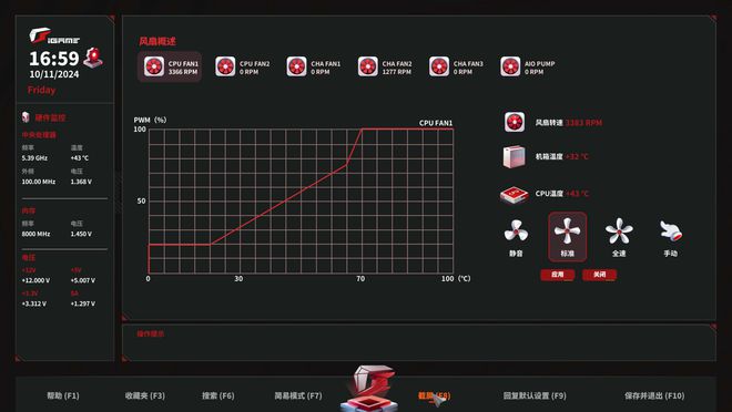 风扇自定义调节页面中会单独展示上方选中的风扇转速信息,右侧给出三档转速预设,也可切换为手动模式,自由调节转速曲线。