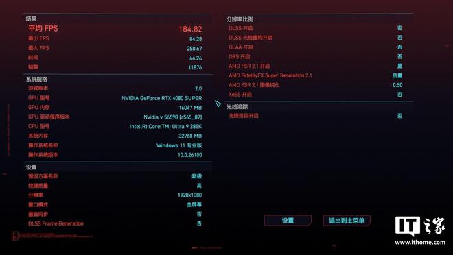 第五款是《赛博朋克:2077》,选择 1080P 分辨率 + 超级画质 + 预设运行游戏自带基准测试,酷睿 Ultra 9 285K 游戏平均帧数为 184 帧,1% Low 帧 84 帧。