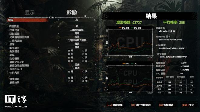 第二款《古墓丽影:暗影》,选择 1080P 分辨率 + 高画质运行游戏自带基准测试,酷睿 Ultra 9 285K 游戏平均帧数为 288 帧,1% Low 帧 210 帧。