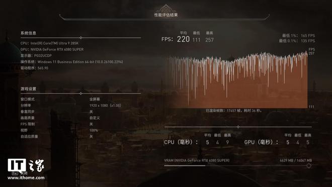 第六款是《刺客信条:幻景》,选择 1080P 分辨率 + 高 + XeSS,并关闭动态模糊,运行游戏自带基准测试。酷睿 Ultra 9 285K 游戏平均帧数为 220 帧,1% Low 帧 165 帧。