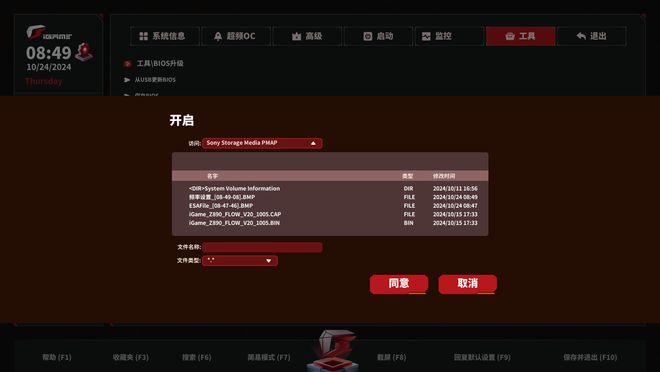 BIOS 更新功能主页面现在改为弹窗显示,最上方是设备选择框,下面是选中设备中的文件列表,选中文件后文件名称一栏自动匹配显示。