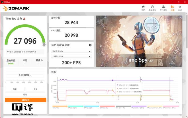 在 3D Mark Time Spy 跑分测试中,酷睿 Ultra 9 285K 的 CPU 分数为 20998 分,跑分时的 CPU 运行频率保持在 5.4GHz。总体跑下来,七彩虹 iGame Z890 FLOW V20 主板足够发挥出酷睿 Ultra 9 285K 处理器的性能,甚至某些测试中表现令人惊喜。