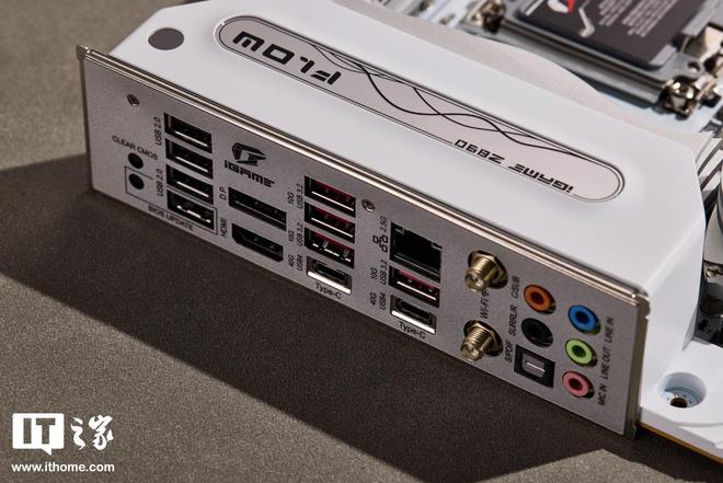 接口方面,iGAME Z890 FLOW V20 主板支持双 USB4 满血 Type-C 接口(40G 速率),BIOS UPDATE 升级键和 BIOS CLEAR 清除键隐藏按钮组,有线 2.5G 网口以及 Wi-Fi7 无线网卡,HDMI2.1 和 DP 接口等。