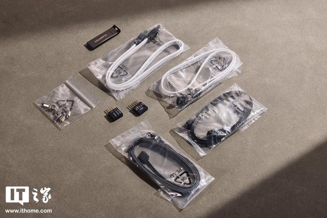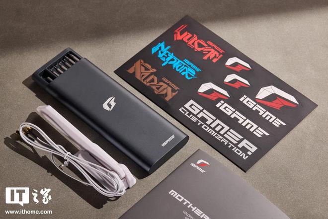 七彩虹 iGAME Z890 FLOW V20 主板定位次旗舰主板,配件自然保持了丰富和实用的风格,除了标配的各种线材、跳线收纳头、增补螺柱包外,还附送了一盒黑色螺丝刀、一个黑色金属优盘以及 iGAME 风格贴纸。外置 Wi-Fi7 增强天线为纯白色,与主板色调保持一致,支持磁吸,配件整体都很实用。