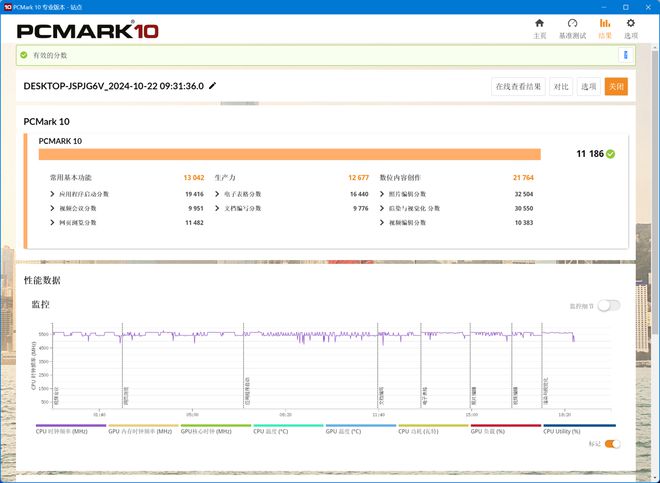 首先是代表综合性能的 PC Mark10,酷睿 Ultra 9 285K 的综合分数为 11186 分,生产力子分数为 12677 分。