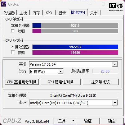 接下来进入理论性能实测,在 CPU-Z 自带的跑分测试中,酷睿 Ultra 9 285K 单核心 927.9 分,多核心 19228.2 分,不得不说功耗给得高就是不一样,多核分数与另一块 Z890 旗舰主板开 XTU 的表现旗鼓相当。
