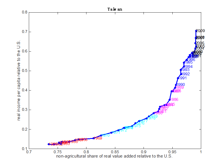 但是值得注意的是,发展之路上的最后一公里才是最难的。例如,中国台湾地区、韩国制造业升级的最后一公里,也就是它们非农产出份额与美国比达到0.9的时候,他们的人均收入和美国相比也仅仅达到0.2到0.3之间,与中国大陆目前一样。因此这最后一公里的产业升级(0.9-1.0)也正是中国现在所面临的挑战。