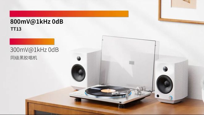 TT13 内置功率放大电路,线路输出电平可达800mV@1kHz 0dB。TT13 还可以搭配有源音箱,用户无需单独购买唱放,降低搭建黑胶唱机系统的成本。