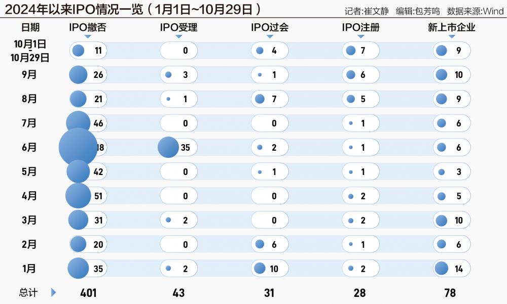 以新上市企业为例,截至10月29日(下同),8月以来共28家,9月24日以来共13家,而今年2~7月共计36家。IPO注册数据方面,8月以来共18家,9月24日以来10家,今年2~7月仅8家。