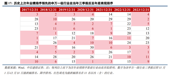 复盘历年Q4和三季报后行业表现规律,部分资金选择在三季报后为明年收益进行布局,通常会预判选择次年业绩靠前的方向,这包括两个方面:一是景气延续,二是困境反转。从历史看,次年业绩排序领先的申万一级板块在当年三季报后常能有靠前的收益表现。
