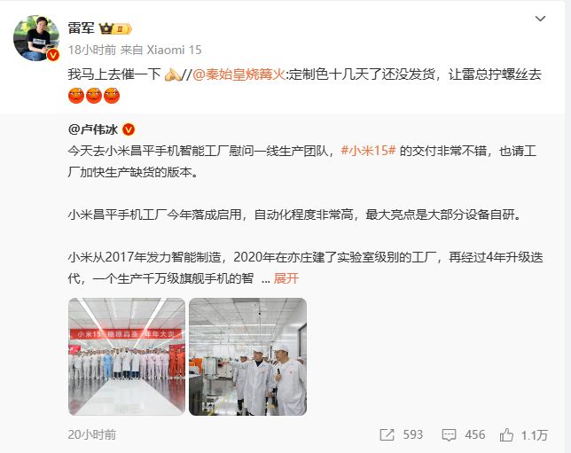 三言科技 11月12日消息,近日,有网友抱怨买小米手机发货慢,雷军现身回复:“我马上去催一下”。
