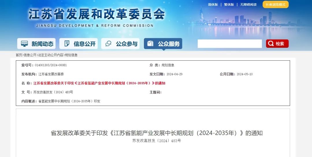 2024年5月10日,江苏省发展改革委印发了《江苏省氢能产业发展中长期规划(2024-2035年)》。
