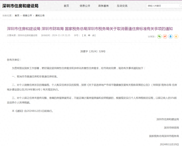 深圳市住房和建设局、深圳市财政局、国家税务总局深圳市税务局发布关于取消普通住房标准有关事项的通知,取消深圳市普通住房和非普通住房标准。