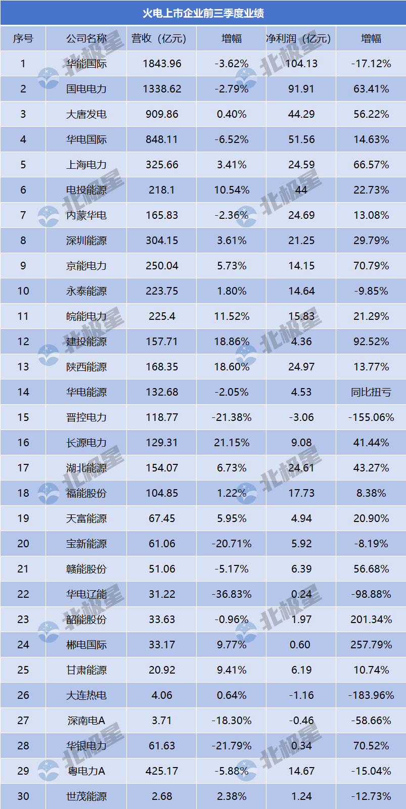 北极星电力网获悉,30家火电上市公司陆续发布2024年三季报。前三季度,19家火电企业净利润实现同比增长。9家火电企业盈利超过20亿元,华能国际净利润超100亿元;晋控电力、大连热电、深南电A净利润出现亏损。