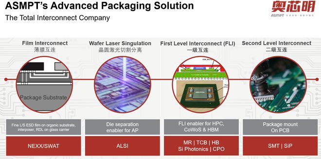 在一级互联方面,有针对MR、TCB、HB、Si Photonics、CPO等技术的自研贴片机解决方案,尤其在TCB领域目前ASMPT也处在全球市占率第一位