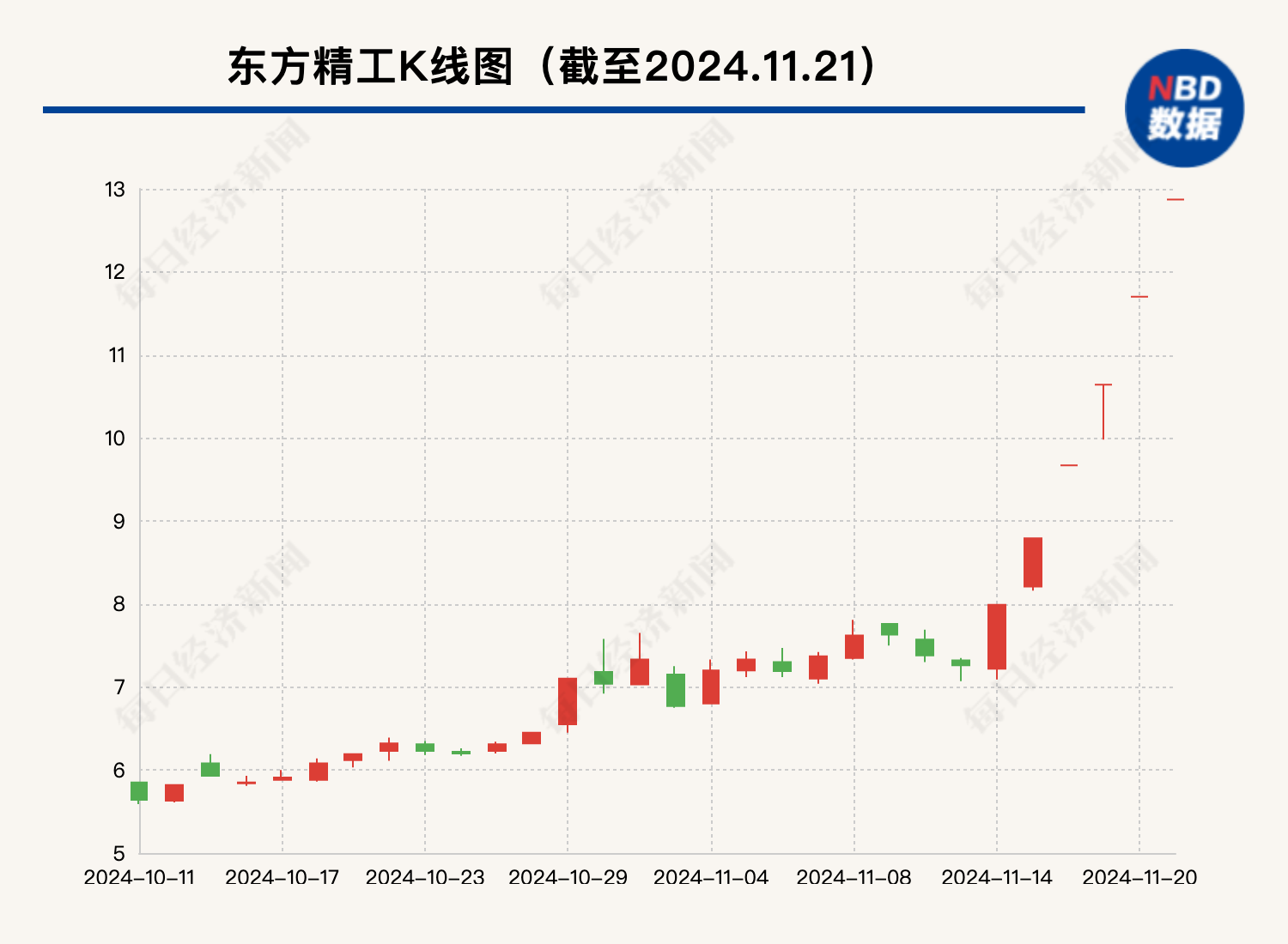 近日,A股“东方”概念走热,多只简称中带有“东方”的个股股价上涨。自11月14日起,东方精工也连续6个交易日涨停。截至11月21日收盘,东方精工股价收于12.87元/股,总市值约为157亿元。自11月14日至11月21日,公司股价累计涨幅达77.27%,市值增长了近70亿元。