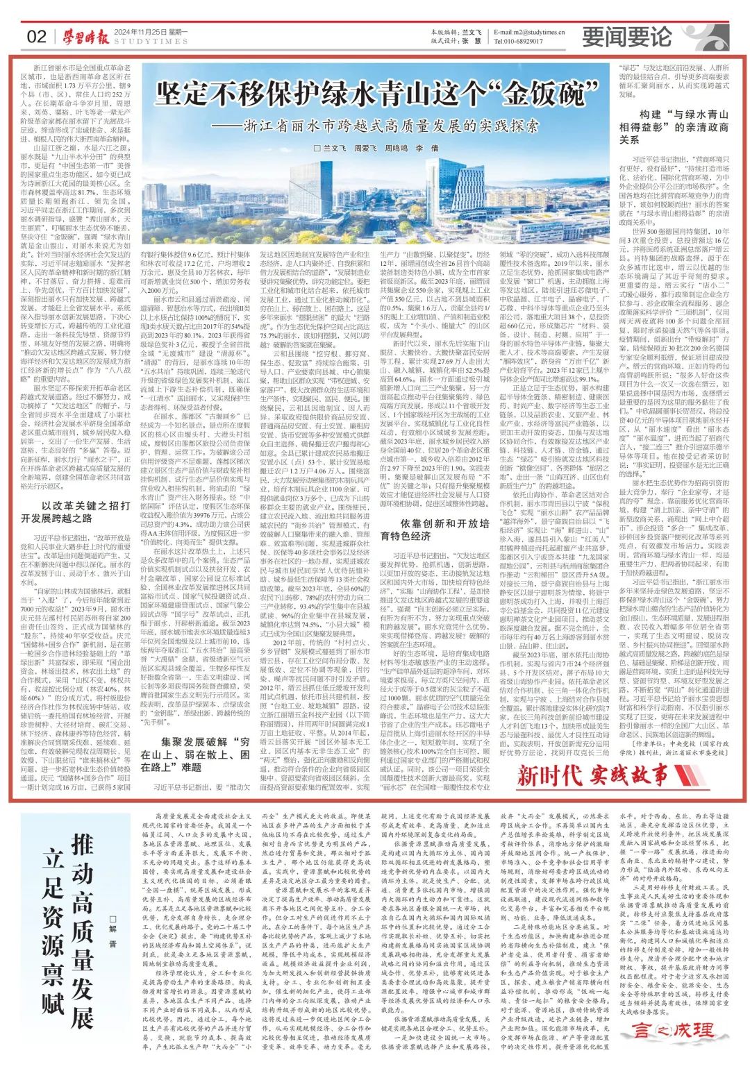 习近平总书记指出,“浙江丽水市多年来坚持走绿色发展道路,坚定不移保护绿水青山这个‘金饭碗’,努力把绿水青山蕴含的生态产品价值转化为金山银山,生态环境质量、发展进程指数、农民收入增幅多年位居全省第一,实现了生态文明建设、脱贫攻坚、乡村振兴协同推进”。回望丽水跨越式高质量发展之路,跨越的底色是绿色、基础是集聚、阶梯是创新开放、雨露是营商环境,实质上走的是科技先导型、资源节约型、环境友好型发展之路,不断拓宽“两山”转化通道的进程。习近平总书记给予丽水宝贵思想财富和科学行动指南,不仅指引丽水实现了巨变,更将在未来发展进程中指引像丽水一样的全国广大山区、革命老区、民族地区创造新的辉煌。