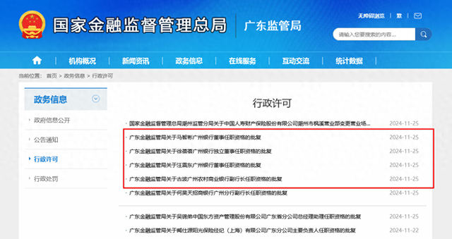 今日公布的监管信息还显示,同为广州金控控股的广州农商银行迎来新的高管。公告显示,古波广州农村商业银行副行长的任职资格获得批准。监管公告称,“《广州农村商业银行关于古波同志高级管理人员任职资格的请示》(穗农商报〔2024〕632号)及相关补正材料收悉”。