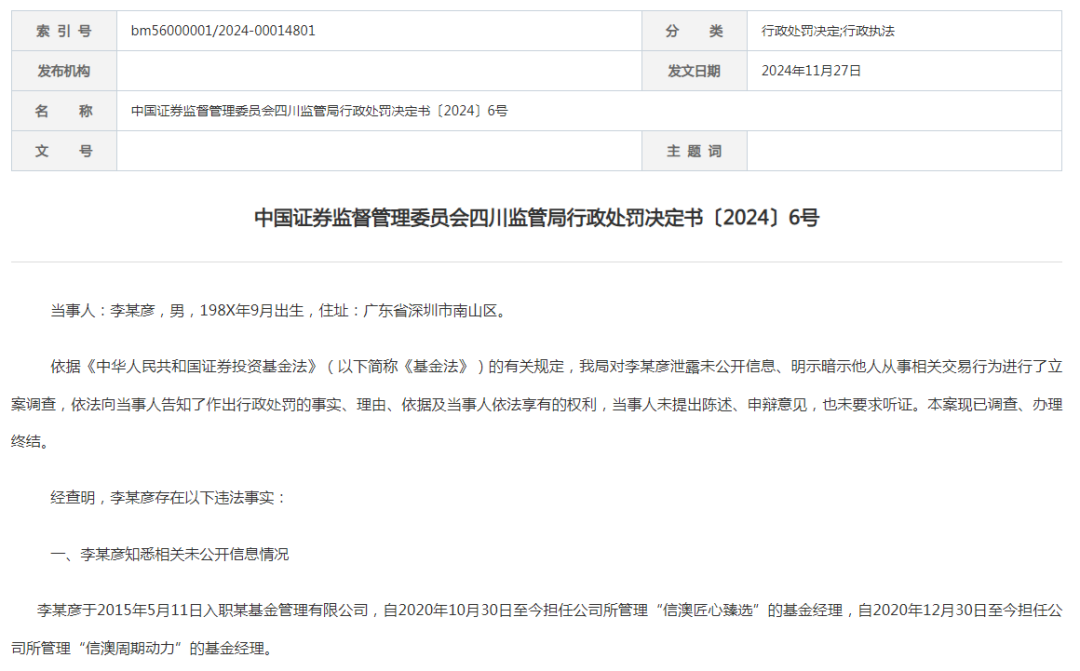 处罚决定书显示,根据当事人违法行为的事实、性质、情节与社会危害程度,依据《基金法》第一百二十三条第一款的规定,四川证监局决定:对李某彦泄露未公开信息的行为,责令改正,并处以80万元罚款;对李某彦明示、暗示他人从事相关交易的行为,责令改正,没收违法所得142889.49元,并处以60万元罚款。