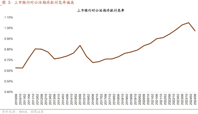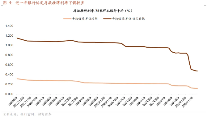 招商证券研报指出,引入“利率调整兜底条款”,预计影响最大为对公协定存款利率。对公协定存款为类活期存款,其期限偏短,占比较高,且前期挂牌利率偏高,因此在存款利率下行周期中,涉及存款服务协议的部分难以快速调整。今年以来协定存款挂牌利率下调较多,国有行对公协定存款平均下调幅度达54bp,预计引入“利率调整兜底条款”后,对公协定存款利率和对公活期存款成本率将会有明显下降。