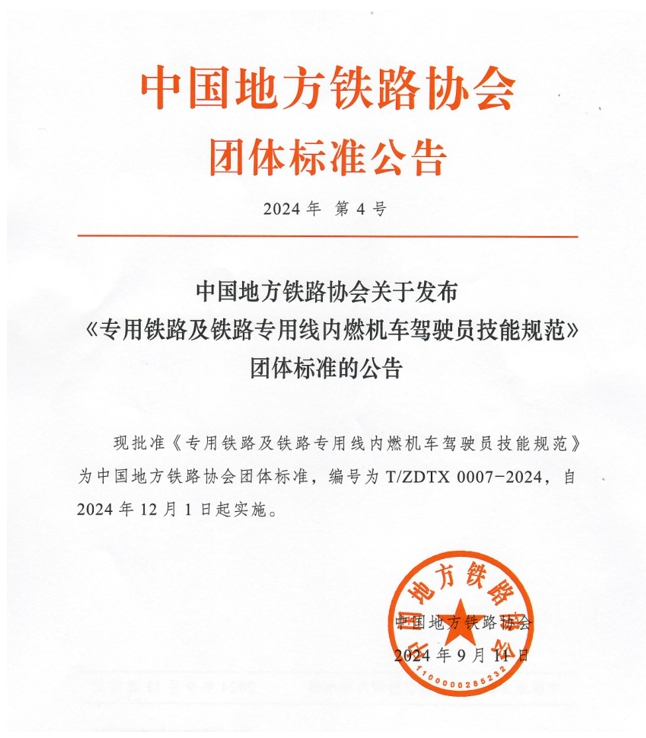 2024年11月,中国地方铁路协会颁布了由神州高铁子公司北神科技参与制定适用于专用铁路及铁路专用线内燃机车驾驶员的团体标准发布公告,批准《专用铁路及铁路专用线内燃机车驾驶员技能规范》(以下简称“规范”)为中国地方铁路协会行业标准。
