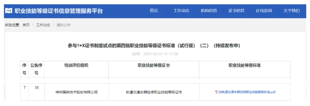 2021年4月,教育部职业技术教育中心研究所发布了《参与1+X证书制度试点的第四批职业技能等级证书标准(试行版)》名单,神州高铁技术股份有限公司参与的《轨道交通车辆检修职业技能等级标准》正式发布。
