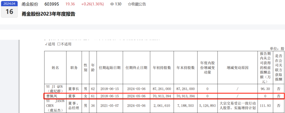 甬金股份2023年年报显示,曹佩凤自2018年6月开始担任公司董事,任期终止日期为2024年5月6日。企查查显示,曹佩凤自2024年6月6日起不再担任公司董事。