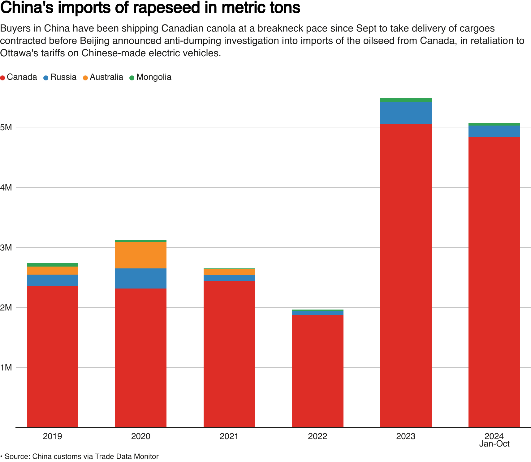 据悉,为尽快完成反倾销调查前签署合同的交付,自9月以来,中国买家一直在以“创纪录的速度”运送加拿大油菜籽。海关数据显示,今年1月至10月,中国进口了507.4万吨油菜籽,高于去年同期的427万吨。其中,有484万吨来自加拿大。