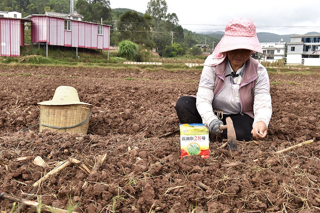 2024年10月22日,云南省大理州巍山县庙街镇新云村委会沙官村村民在田间播种油菜籽 视觉中国