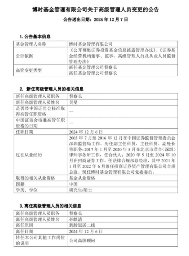 上证报中国证券网讯(记者 何漪)12月6日,博时基金发布公告称,自2024年12月6日起,吴曼正式就任博时基金督察长。博时基金原督察长孙麒清因到龄退居二线。